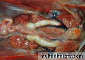 In adults:Oophoritis (hemorrhagic or atrophied), salpingitis, peritonitis (ascites), and orchitis