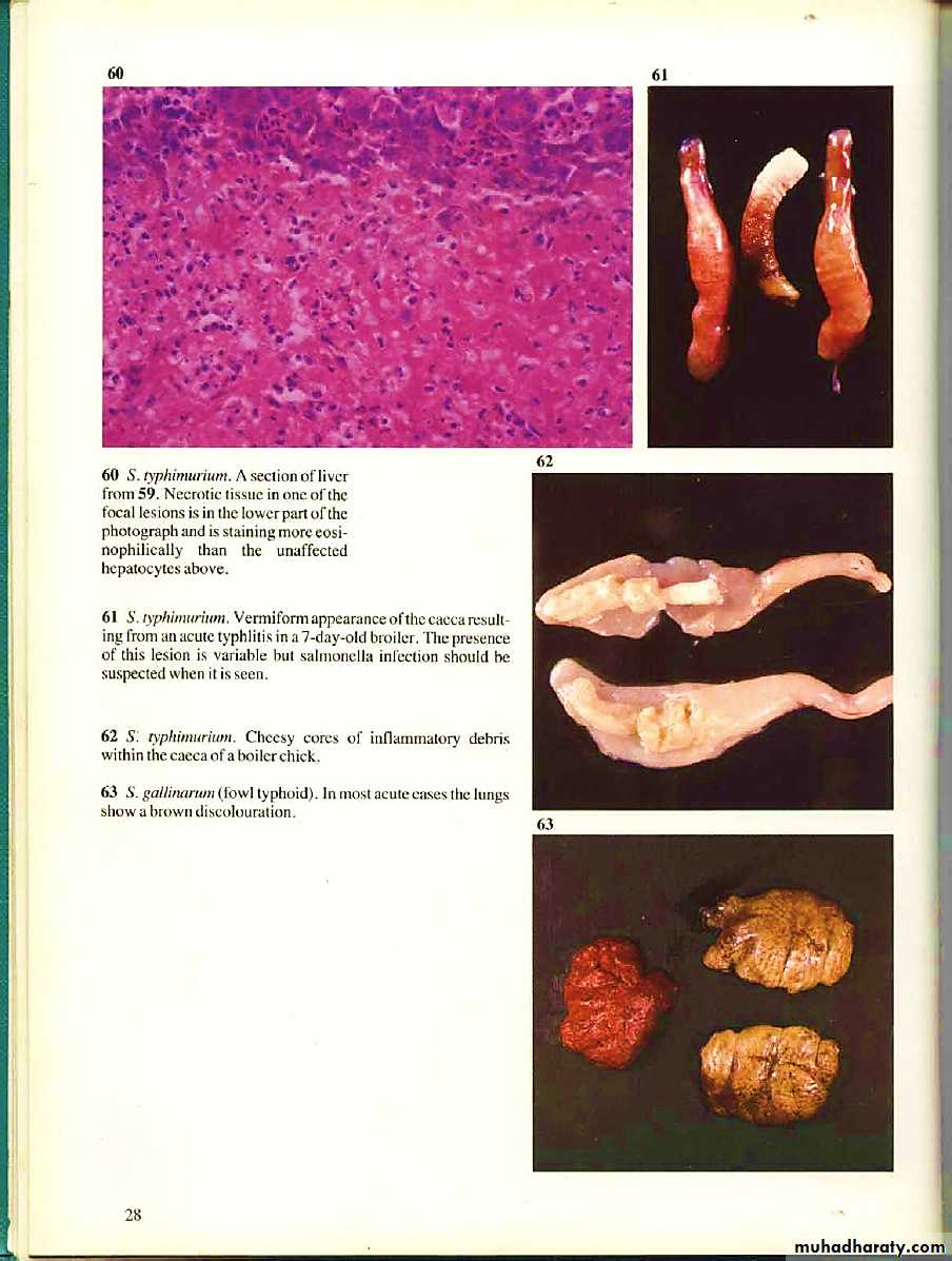In different species of birds: similar to acute septicemia lesions of pullorum and typhoid.In pigeons: brain, bone, and gonads often involved.