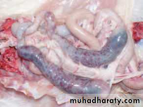Lesion – hemorrhage with varies intestine in different part along intestine . The hemorrhage petechial and could be seen through the intestinal wall