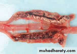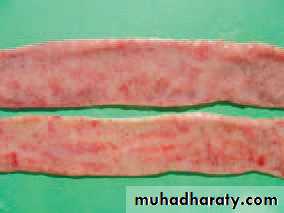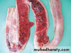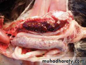 Lesion – content mixed with fresh or clotted blood and mucous coat is mottled with multiple petechial hemorrhage