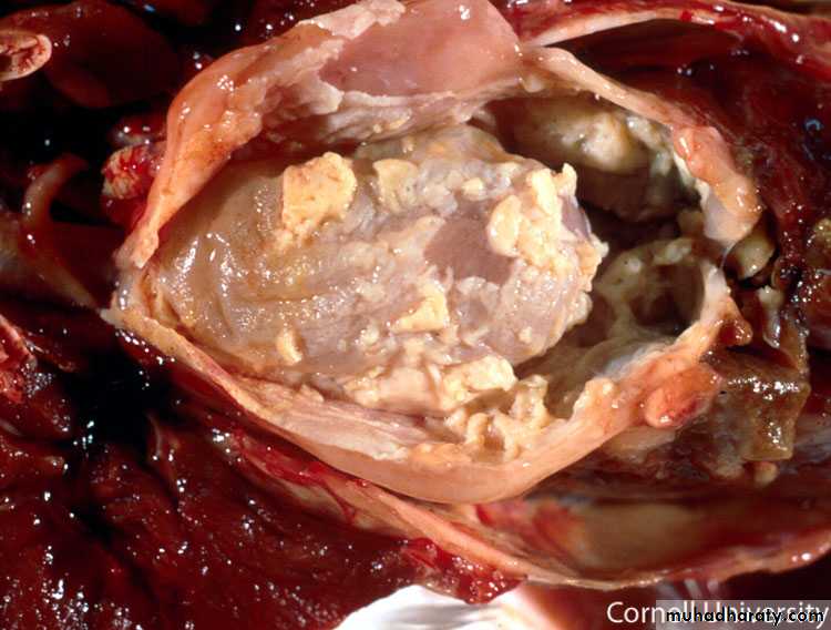 Lesion – the epicardial (membrane of turkey thickened and covered with fibrinous exudate reline dry yellow exudate adhere to epicardium