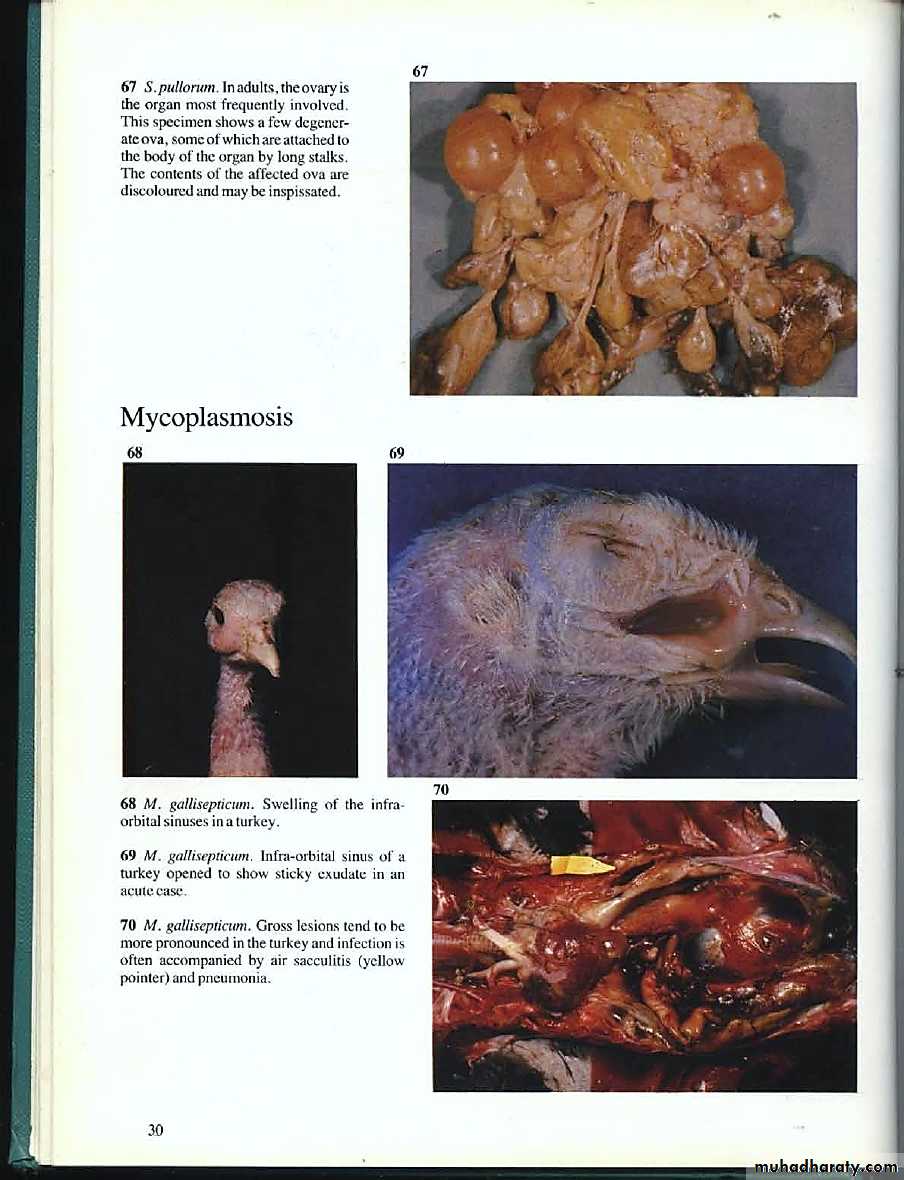 S. pullorumPic. 9organ: ovary (adult)lesion:this specimen show a few degenerate ova, some of which are attached to the body of the organ by long stalks. The content of the affected ova are discolored and may be inspissated (thickener).