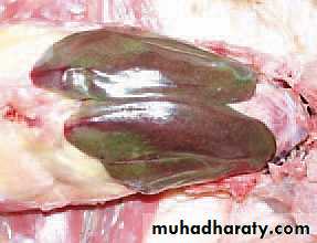 Lesion – moderate acute fibrinous peri hepatitis the liver is often enlarged and covered with fibrin