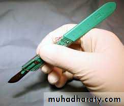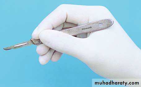 The scalpel is held in a pen - grip and the hand is supported against slipping. The incision is made with one firm, slow stroke of a sharp blade, which is kept vertical to the epithelial surface .