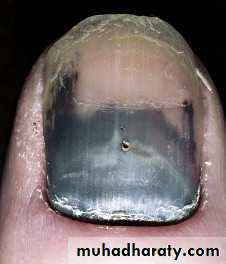 Trauma to the proximal nailfold causes hemorrhage that may not be apparent for days and then grows with the nail.