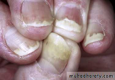 Begins at the distal groove and progresses irregularly and proximally, causing part or most of the plate to become separated.The nonadherent portion of the nail is opaque with a white, yellow or green tinge.