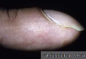 Rx: Separated skin should be cut before extension occurs. Constant lubrication of the fingertips with skin creams and avoidance of repeated hand immersion in water are beneficial.