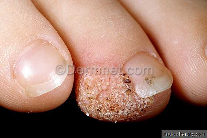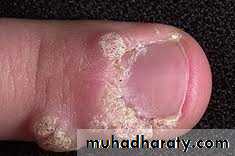 Warts on the lateral nailfold and on the fingertip may extend deeply under the nail.