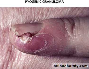 Also called “lobular capillary hemangioma“May form at the lateral nailfold caused by an ingrown nail.