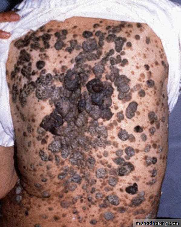 The sign of Leser–Trélat is a rare cutaneous marker of internal malig­nancy (in particular gastric (60%) or colonic adenocarcinoma, breast carcin­oma, and lymphoma). It is considered to be a paraneoplastic cutaneous syndrome characterized by an abrupt and striking  in the number and/or size of SKs occurring before, during or after an internal malignancy has been detected majority and of the lesions are located on the back, followed by the extremities, face and abdomen and usually associated with pruritus. Neoplasm may secrete TGF-alpha  epithelial hyperplasia.