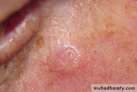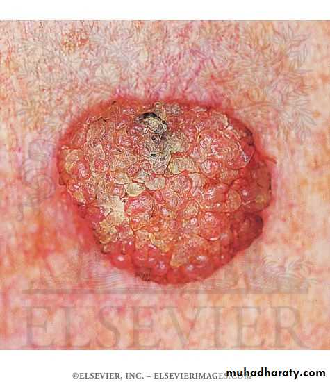 Usually presents as a smooth­ surfaced, dome ­shaped papule. Slight hyperkera­tosis and papillomatosis are often present, while the greatly thickened epidermis typically contains a preponderance of basaloid cells.