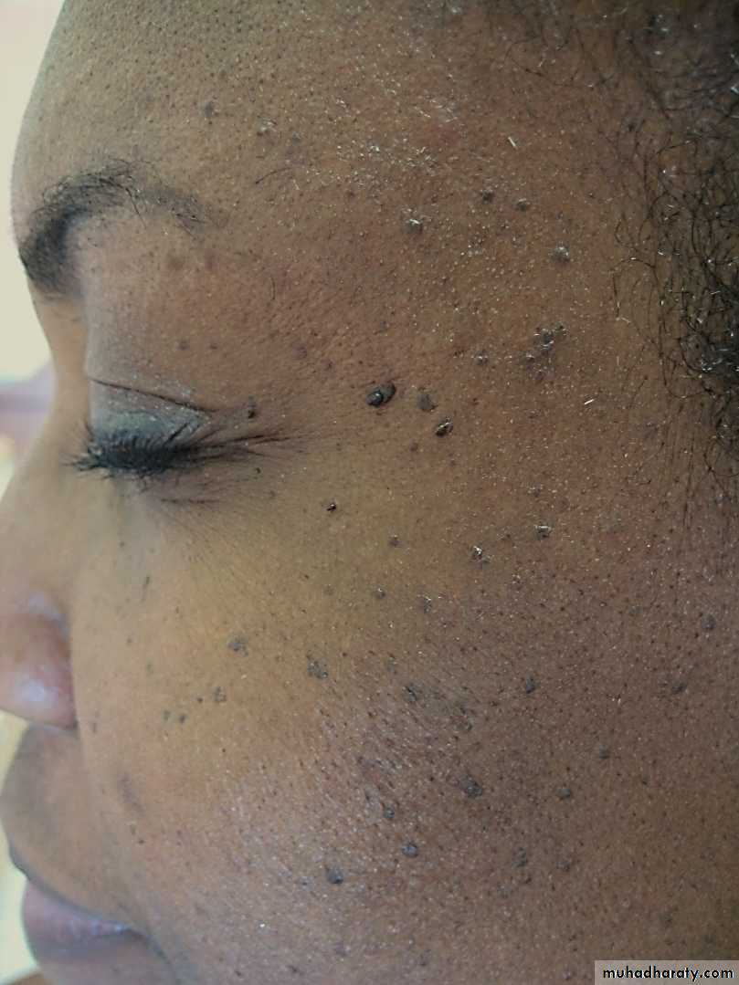 Multiple, small, symmetric hyperpigmented, sessile to filiform, smooth-surfaced papules measuring from 1 to 5 mm.