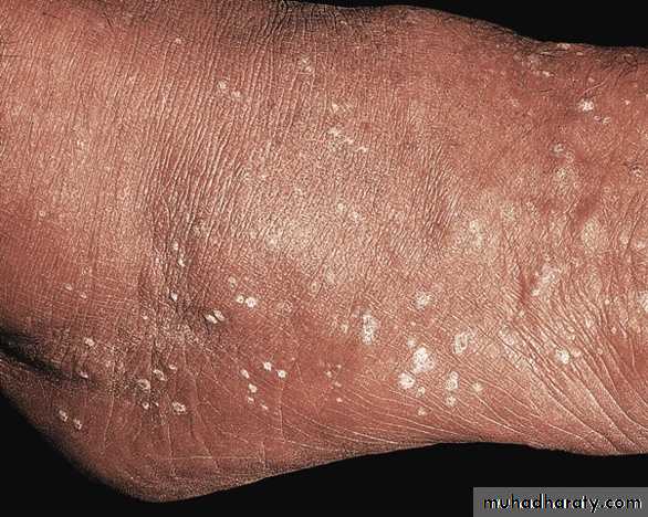 Small white-gray papules or plaques scattered on dorsal feet and ankles of older fair-skinned individuals.