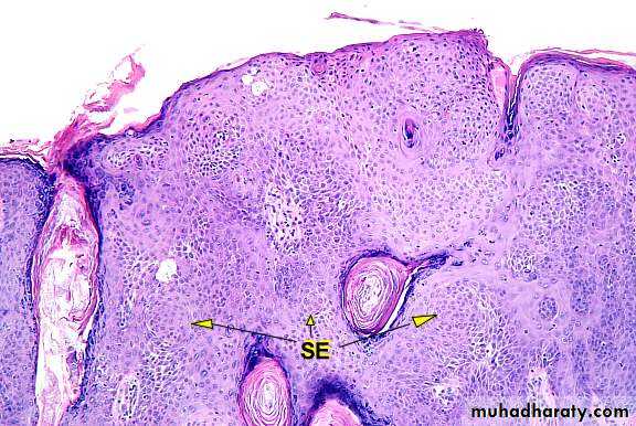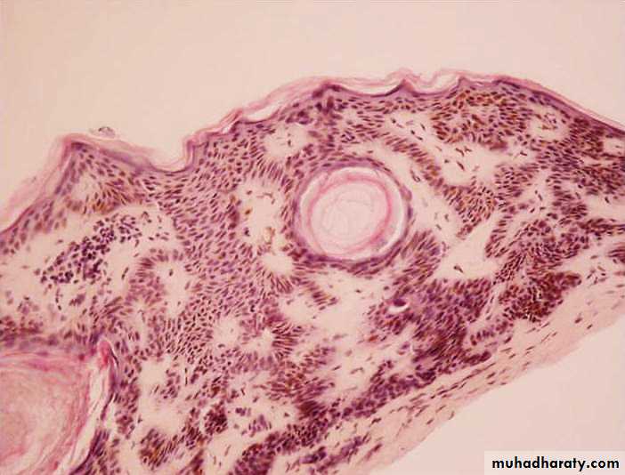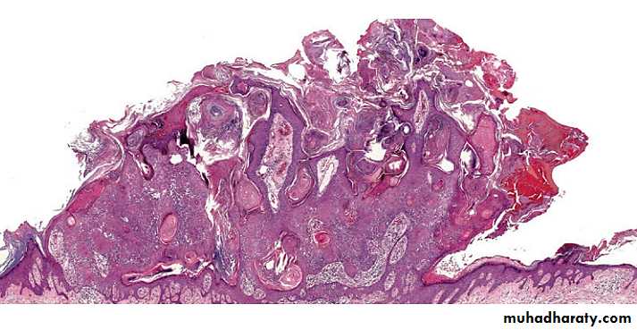 Histologically, The keratinocyte proliferation seems to surround one or several follicular canals that open to the surface. squamous eddies and inflammation are common.