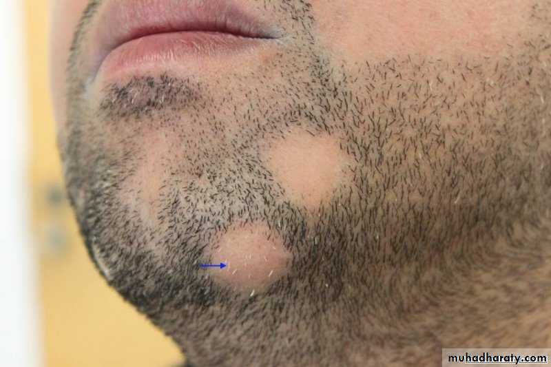 The eyelashes, beard, and, rarely, other parts of the body may be involved.