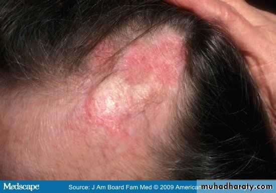 Most patients report the sudden occurrence of one to several 1- to 4-cm areas of hair loss on the scalp that can be easily concealed by covering with adjacent hair.The skin is smooth and white or may have short stubs of hair.