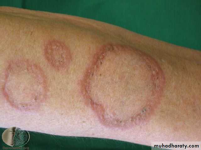 The disease begins with an asymptomatic, flesh-colored or red papule that undergoes central involution. Over months, a ring of papules slowly increases in diameter to 0.5 - 5 cm.