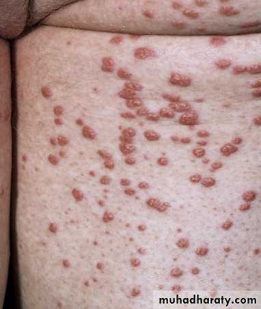 In time the skin may become quite thickened as the lesion develops a leathery, warty, or papillomatous surface.