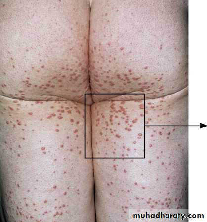 These are yellow, 1- to 4-mm papules with a red halo around the base.They appear suddenly in crops on extensor surfaces of the arms, legs, and buttocks and over pressure points.