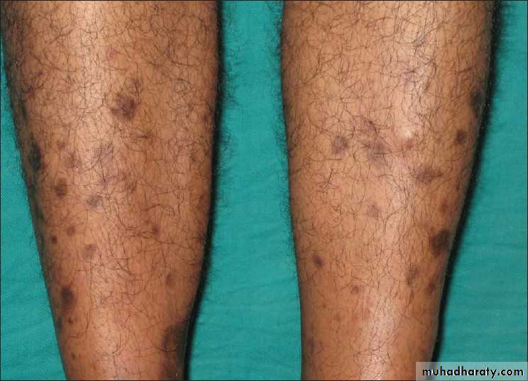 Mostly lesions are confined to the anterior lower legs.