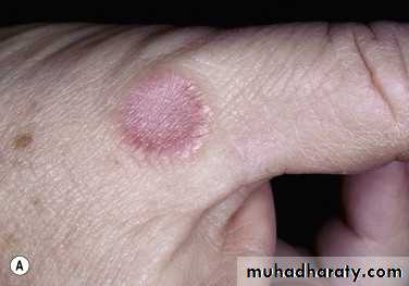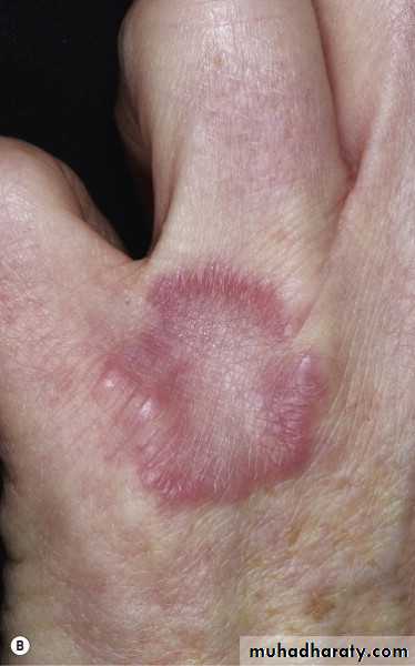 Clinically: The eruption begins as an oval, violaceous patch that expands slowly. The advancing border is red, and the central area turns yellow-brown then atrophies and exhibits a waxy surface; telangiectasias are present. Ulceration occurs, particularly following trauma.