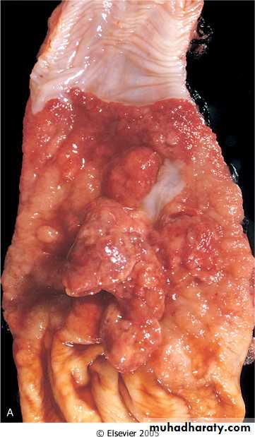 Adenocarcinomas appear to arise from dysplastic mucosa in the setting of Barrett esophagus. Unlike squamous cell carcinomas, they are usually in the distal one third of the esophagus and may invade the subjacent gastric cardia.