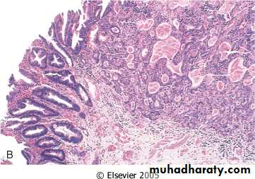 5- Two additional features are of note, 1st Intestinal metaplasia refers to the replacement of gastric epithelium with columnar and goblet cells of intestinal variety. This is significant, because gastrointestinal-type carcinomas appear to arise from dysplasia of this metaplastic epithelium. Second, H. pylori induced proliferation of lymphoid tissue within the gastric mucosa has been implicated as a precursor of gastric lymphoma.