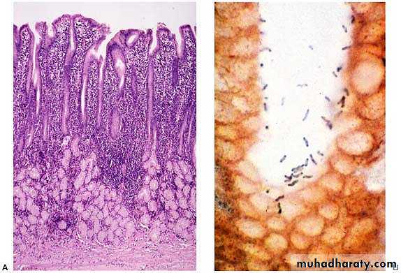 3- When present H.pylori organisms are found nestled within the mucus layer overlying the superficial mucosal epithelium.