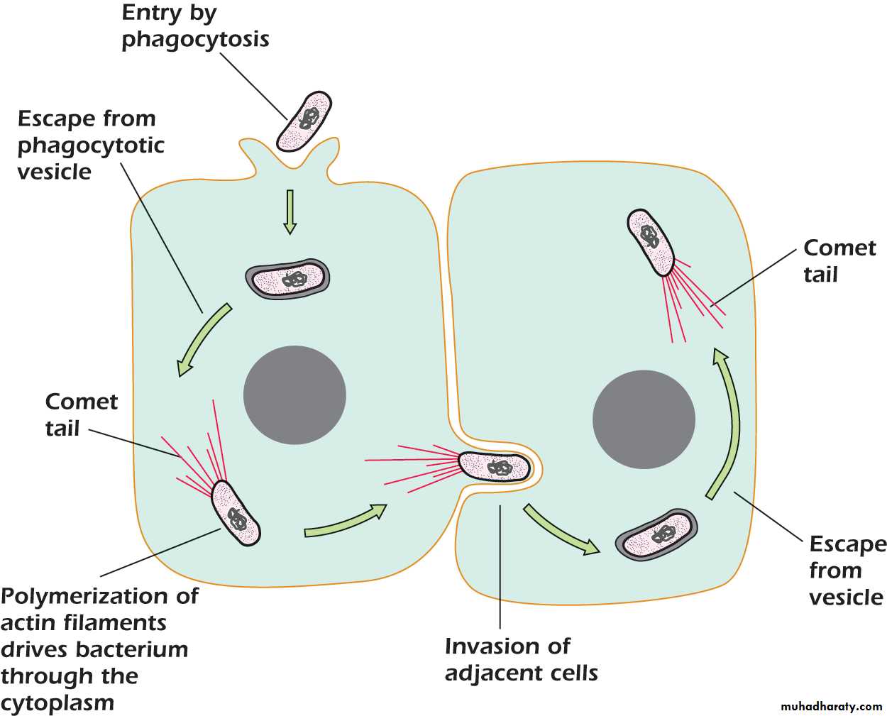 5-These filopods are ingested by next epithelial cells, macrophages, the listeriae are released, and the cycle begins again. L monocytogenes can move from cell to cell without being exposed to antibodies, complement, or polymorphonuclear cells.