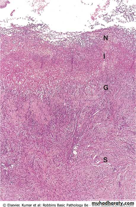 The histologic appearance varies with the activity, chronicity, and degree of healing. In a chronic, open ulcer, four zones can be distinguished :