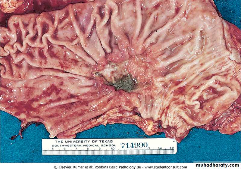 Flat or depressed malignancy presents only as regional effacement of the normal surface mucosal pattern. Excavated cancers may mimic, in size and appearance, chronic peptic ulcers, although more advanced cases show heaped-up margins .Uncommonly, a broad region of the gastric wall, or the entire stomach, is extensively infiltrated by malignancy.