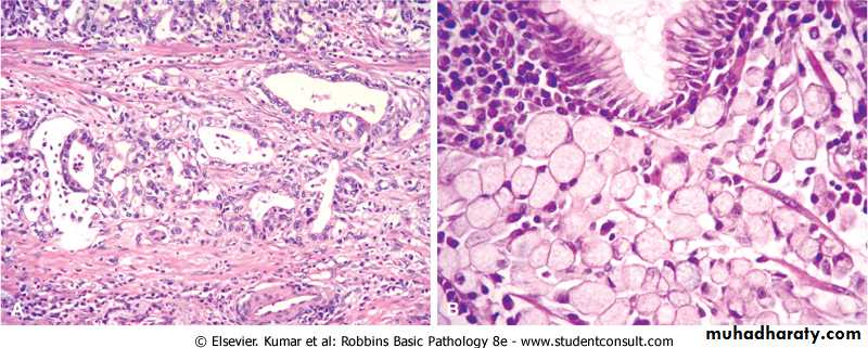 Gastric cancer. A, H&E stain demonstrating intestinal type of gastric carcinoma with gland formation by malignant cells that are invading the muscular wall of the stomach. B, Diffuse type of gastric carcinoma with signet-ring tumor cells.