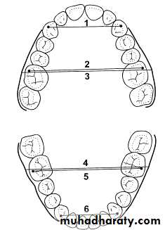 In normal occlusion the arch width between tips of MB cusps of upper first molars should be 2 mm greater than the width between buccal grooves of lower molars.