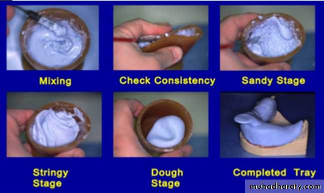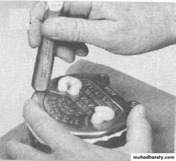 A- After the stone of the flask is dry, the inner side of the mold and the cast are painted with a separating medium by a camel's hair brush and allowed to dry. The separating medium must not come in contact with the teeth because wax residue on the teeth is contaminant and causes adhesion failure with the denture resin. A second layer of separating medium is applied on the inside of the mold and the flask is allowed to cool to room temperature.B- Heat cure acrylic resin dough is made by mixing the powder (polymer) and liquid (monomer) to form 'dough' which is packed into a gypsum mold for curing. The ratio of powder to liquid is important since it controls the workability of the mix as well as the dimensional changes on setting. The mixing should be done in a clean jar which should be covered to prevent evaporation of the monomer.
