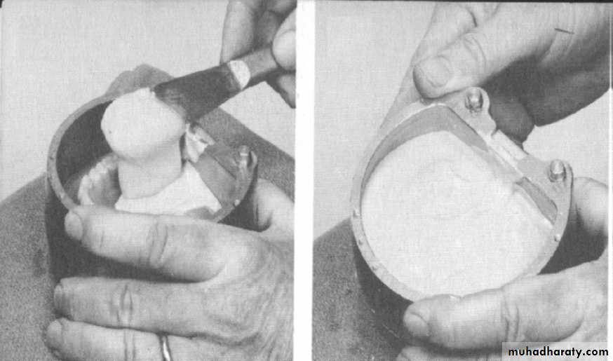 1- The master cast and the wax dentures are placed in the flask, to insure that the cast fit in the flask.