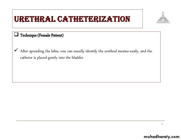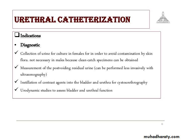 Urethral catheter or Suprapubic catheter: if urethral trauma or injury are expected