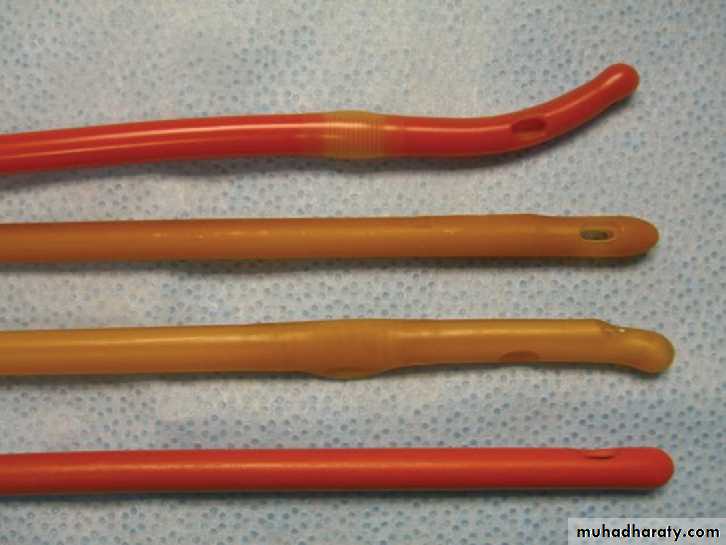 BLUNT STRAIGHT TIP: most common (foley)CURVED TIP (COUDE): high bladder neck, prominent median lobe of prostate