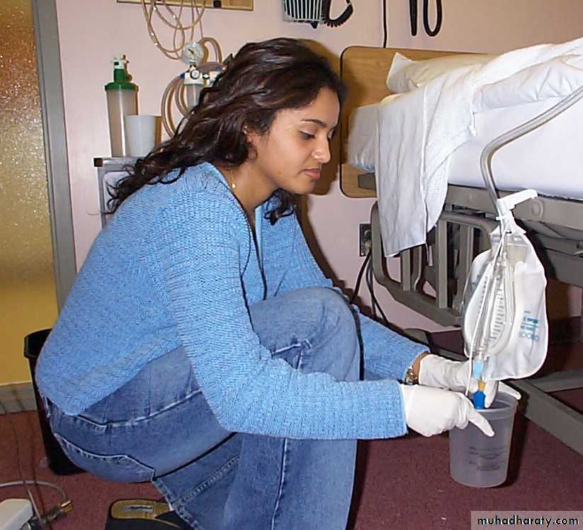 Gravity is important for drainage and the prevention of urine backflow. Ensure that catheter bags are always draining downwards, do not become kinked and are secured and below thigh level. Metal or plastic hangers should be attached to the side of the bed. Cloth bags tied to the bed to support the bags are also available10/9/2016
