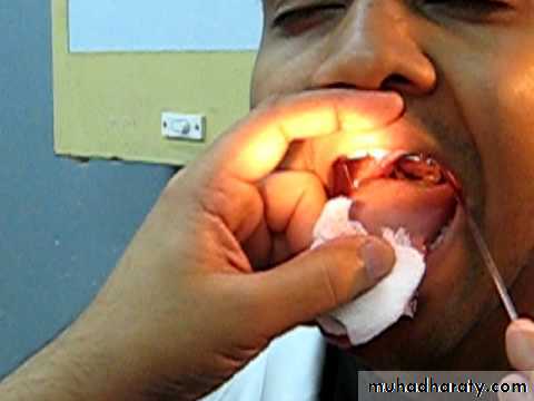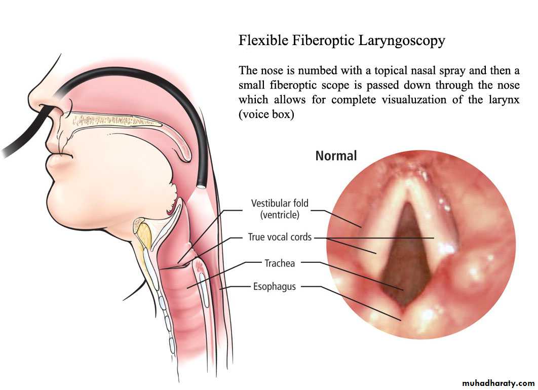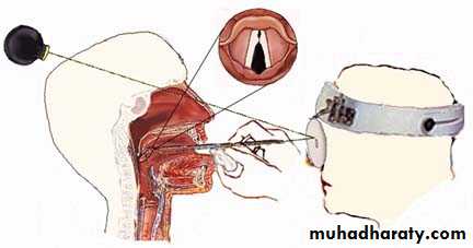 Indirect laryngoscopy is done after warming the mirror ( to avoid fogging) and after pulling the tongue by a piece of gauze.