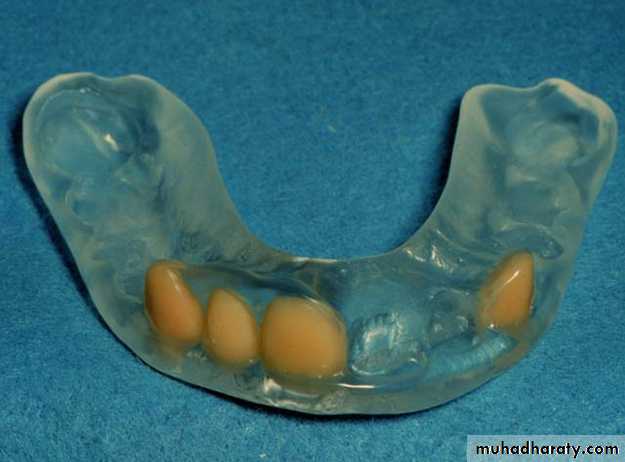 Sake of appearance. Temporary improvement of esthetics after sudden loss of teeth, before sufficient healing has occurred to fabricate a permanent prosthesis (accident, after extractions)Maintenance of a space. Children-arches still growing, and a permanent prosthesis would not fit for long. Temporary space maintenance for missing teeth in esthetic areas (congenital, caries, trauma).