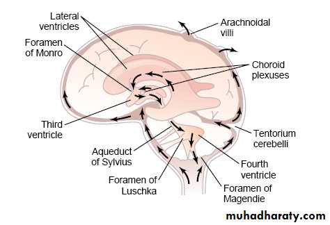 • From the fourth ventricle, the fluid passes slowly through the median aperture and the lateral foramina of the lateral recesses of the fourth ventricle and enters the subarachnoid space
