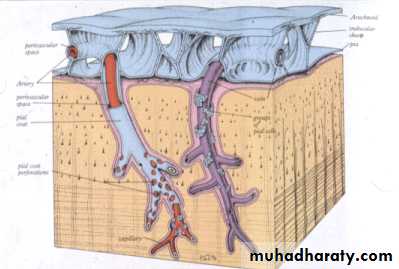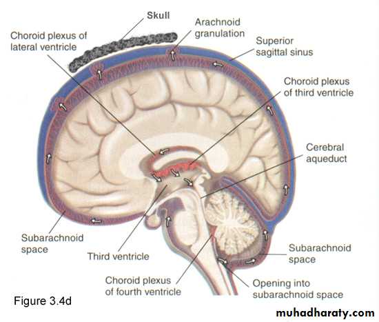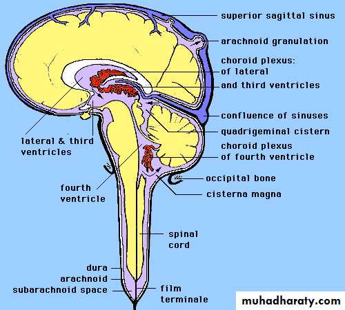 • 70 % CSF produced in choroid plexuses of lateral, third and fourth ventricles• CSF flows through the subarachnoid space between the arachnoid and pia mater
