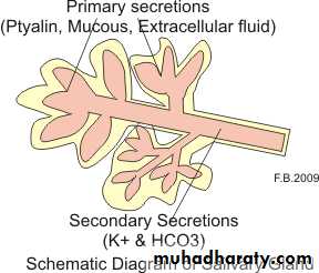 2- Mucous secretion: containing mucin (glycoprotein) for lubricating purposes. The parotid glands secrete serous type, submandibular and sublingual glands secrete both. The buccal glands secrete only mucous.