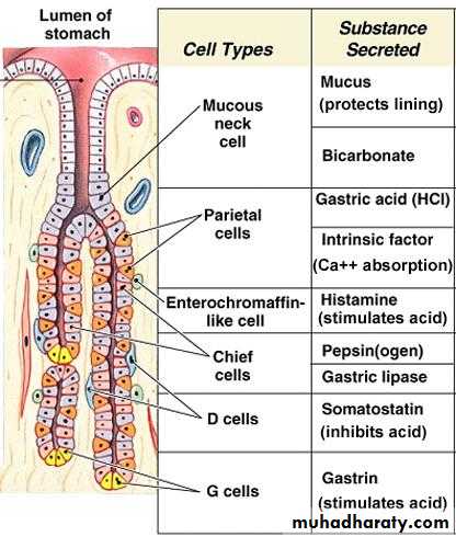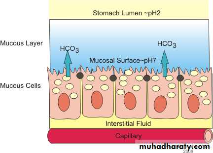 1- Mucous cells :-Mucous secretion rich in alkaline bicarbonate protects the stomach from the Hydrochloric acid of the gastric juice.