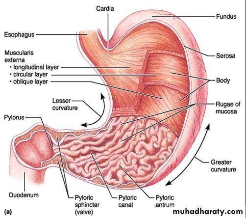 Structure of the stomach:The stomach can be divided into: Fundus, body, antrum and pylorus regions lesser curvature and greater curvature. The stomach has three layers of muscle: an Outer longitudinal layer, a middle circular layer and an inner oblique layer. The stomach has very rich blood and lymphatic supply.