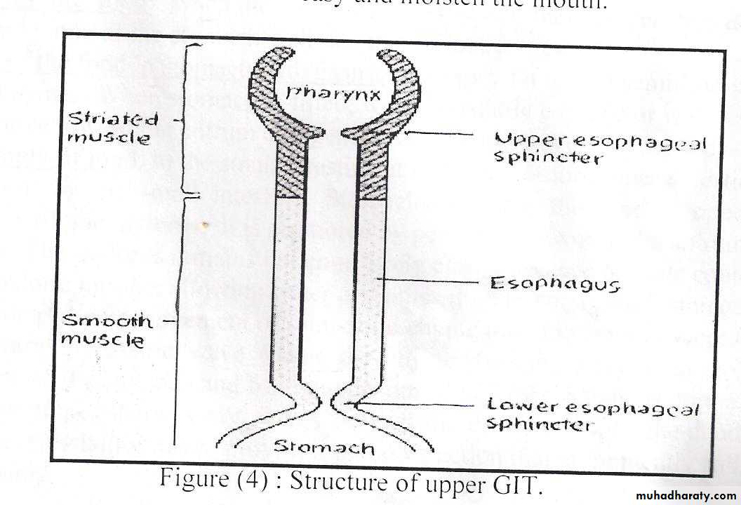 C- Esophageal phase: it is controlled by swallowing reflex. in this phase, food propelled through the esophagus to the stomach the esophageal secretions are entirely mucous provide lubrication for swallowing. Once the bolus has passed through the upper esophagus sphincter in pharyngeal phase. The reflex closes the sphincter. so food cannot reflux into pharynx. Primary peristaltic wave coordinated by swallowing reflex, travels down the esophagus propelling the food along the secondary wave which is mediated by the enteric nervous system, begins at site of distension and travels down ward.