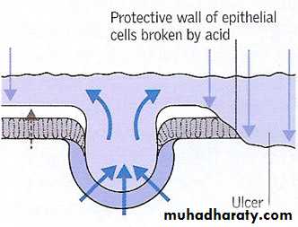 1- Breakdown of the barrier in which (the Stomach is lined with highly resistant mucous cells that secrete a viscid and alkaline adherent mucous. And the adjacent epithelial cells has tight junction between the gastric barrier prevent the stomach from auto digestion and irritation by gastric secretion or by infection with a bacterium ( Helico bacteria pylori ), disrupts this barrier, as do aspirin and other nonsteroidal anti-inflammatory drugs (NSAIDs), which inhibit the production of prostaglandins which play important role in the genesis