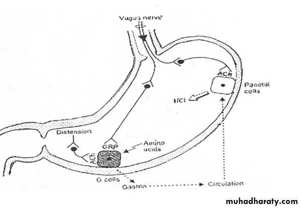2- Gastric phase: 60% of total HCL secreted in response to meal. The stimuli are distension of the stomach causes direct stimulation of the parietal cells by vagus nerve and indirect stimulation of the parietal cells via gastrin release .presence of breakdown products of protein, amino acid and small peptides gastrin releasing peptide(GRP)to stimulate gastrin release. Alcohol and caffeine also stimulate gastric HCL secretion.Gastric phase