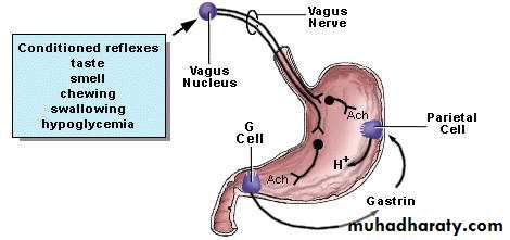 1- Cephalic phase: 30% of total HCL secreted in response to meal. The stimuli for HCL secretion in this phase are smelling, tasting, chewing, swallowing and conditioned reflexes. stimulation of the parietal cell by vagus nerves, which release Ach (direct). And stimulation of the parietal cells by gastrin (indirect), vagus nerve release, at G cells stimulating gastrin secretion, gastrin enters the circulation and stimulate the parietal cells.