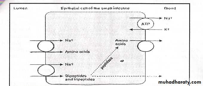 Amino acid are transported from the lumen into the cell by Na-amino acid cotransporter in apical membrane energy by a gradient.There are four separation cotransporters; each one for neutral, acidic, basic, and other amino acids.